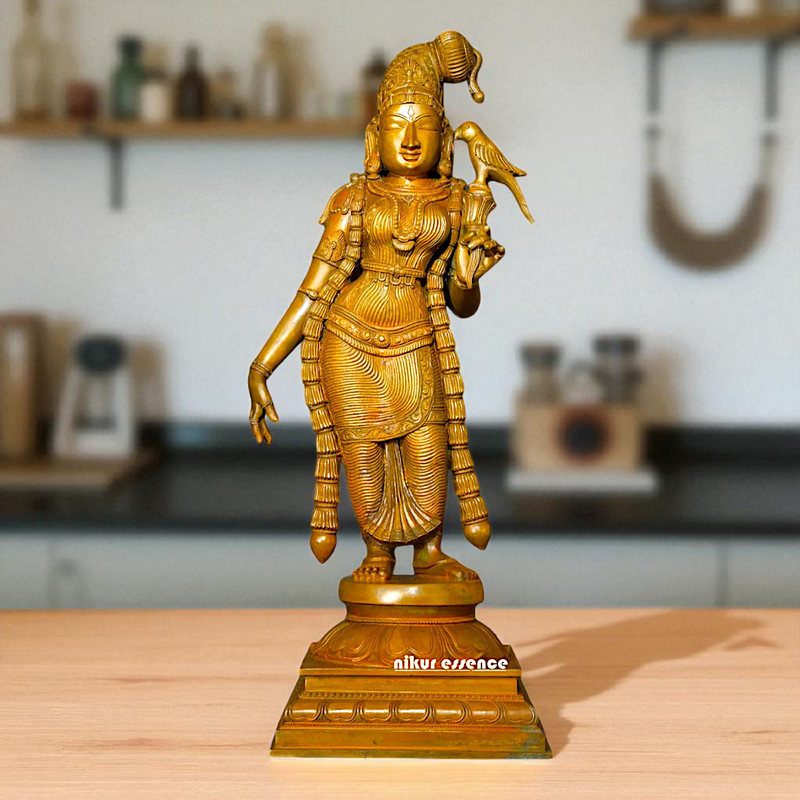 Elevate your spiritual space with this stunning 24-inch Panchaloha Andal statue, gracefully standing with a parrot symbolizing divine wisdom and devotion. Crafted from a sacred blend of five metals, this idol embodies the essence of Goddess Andal, the revered Vaishnavite saint known for her unwavering love for Lord Vishnu. With intricate detailing and a serene expression, this masterpiece radiates divine grace, making it ideal for home temples, pooja rooms, or as a treasured spiritual gift.