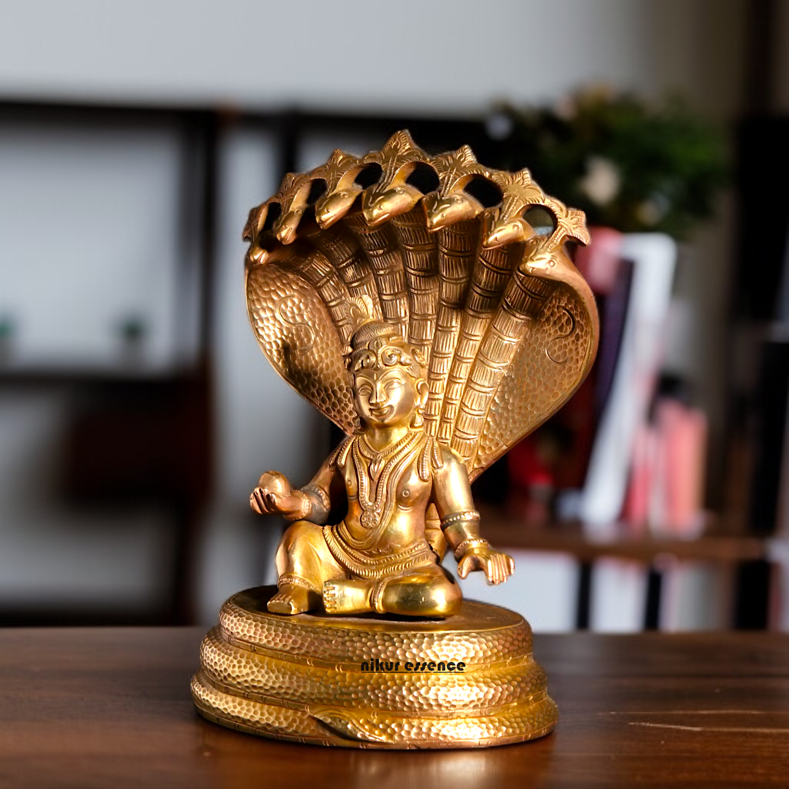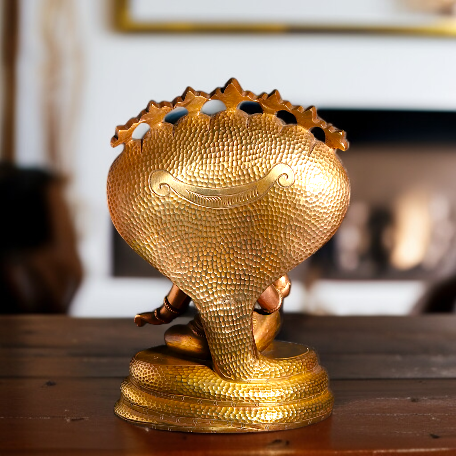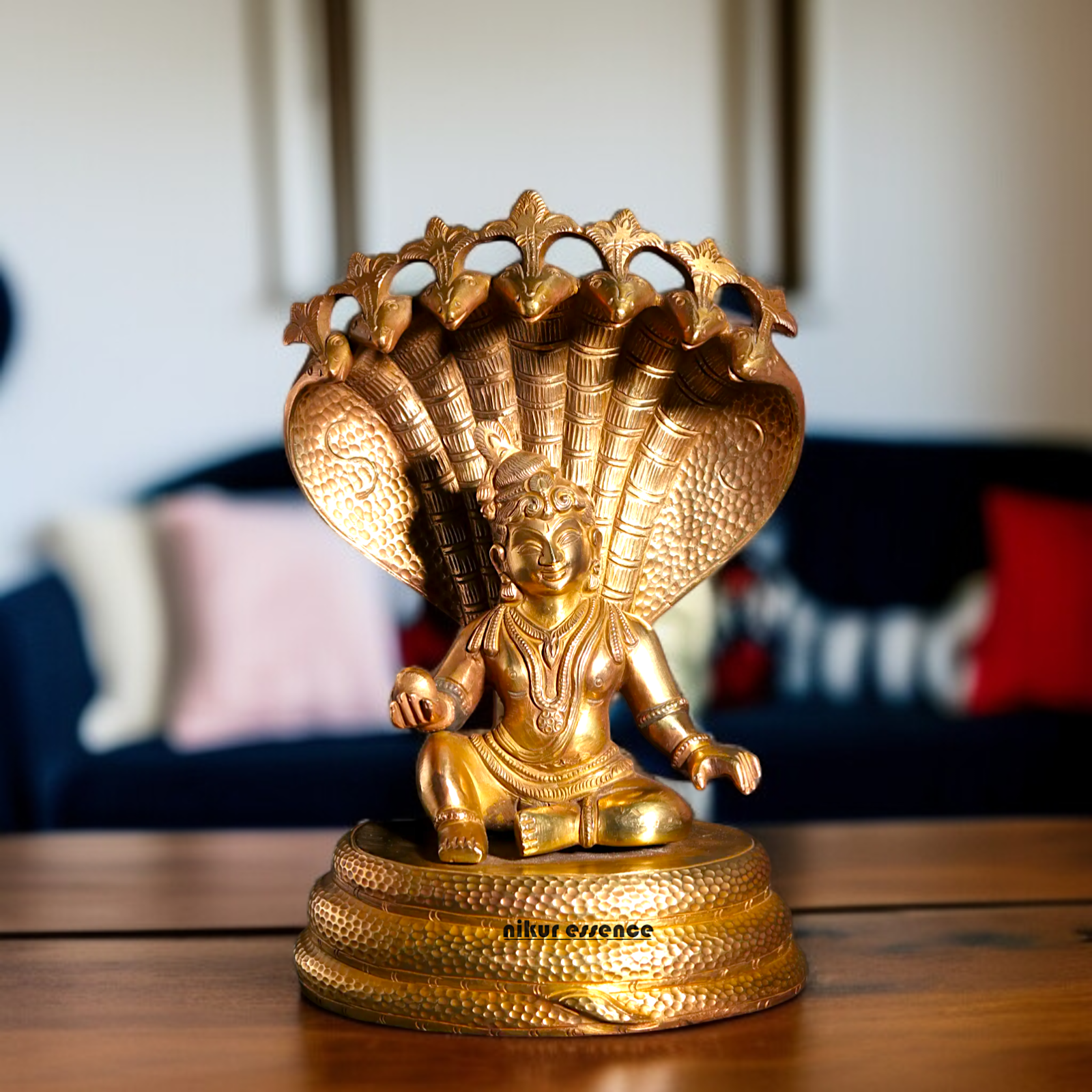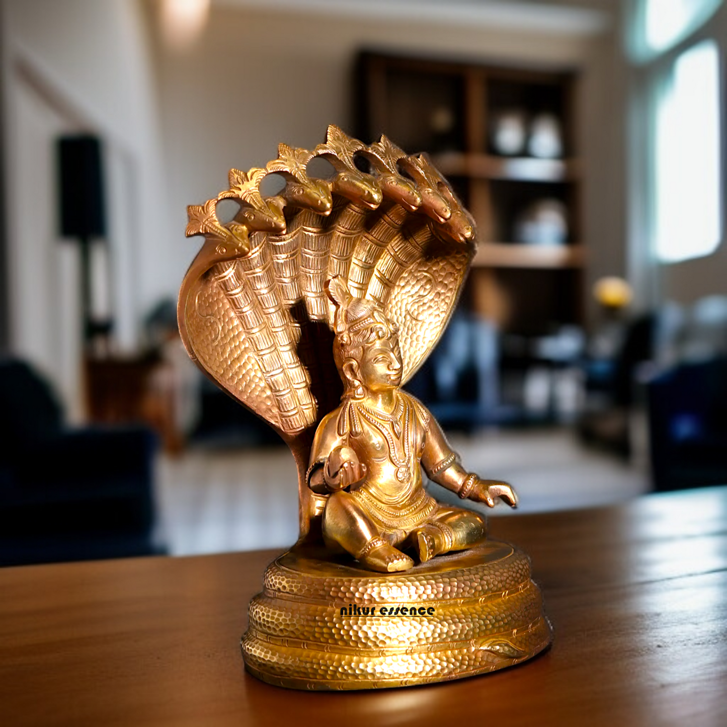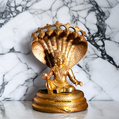 The Bal Krishna Seated on Sheshnag statue, crafted in Panchaloha (a sacred five-metal alloy), stands 7 inches tall and beautifully depicts Lord Krishna as a divine child resting gracefully on the mighty serpent Sheshnag. This exquisite sculpture symbolizes Krishna’s eternal protection, wisdom, and divine playfulness. The intricate detailing captures his serene expression and the grandeur of Sheshnag, making it a perfect addition for home altars, meditation spaces, and sacred décor. A symbol of divine love, protection, and cosmic balance, this idol is ideal for devotional practices, temple placements, and gifting for auspicious occasions.
