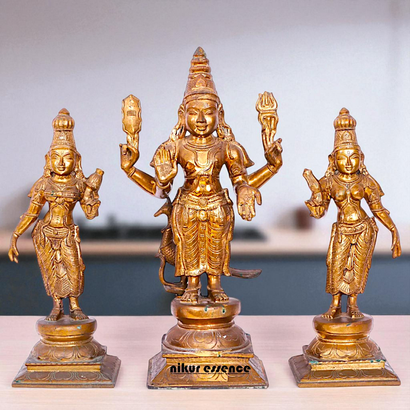 The Big Kartikeya with Goddess Devasena and Valli Blessing Standing Panchaloha Idol (20 Inches) is a magnificent representation of Lord Murugan, the divine warrior, standing with his consorts, Goddess Devasena and Goddess Valli. Symbolizing wisdom, courage, and divine harmony, this beautifully crafted idol is made from sacred Panchaloha (five-metal alloy), radiating spiritual energy and blessings. Ideal for temples, home altars, and Vastu placements, it invites protection, prosperity, and divine grace into your space. A must-have for devotees seeking Murugan’s blessings and guidance.