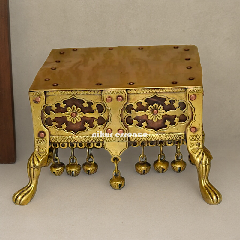 Brass Bhagwan Chowki Stool from Nikur Essence. This finely crafted stool, standing at an approximate height of 9 inches, is made from high-quality brass, giving it a luxurious and long-lasting shine. Its compact size makes it perfect for use in small spaces or as a decorative piece for your prayer area. The intricate detailing and divine symbolism make it a great addition to any home, temple, or office. Ideal for placing idols, religious offerings, or as a charming accent piece, this stool exudes spiritual grace and traditional craftsmanship.