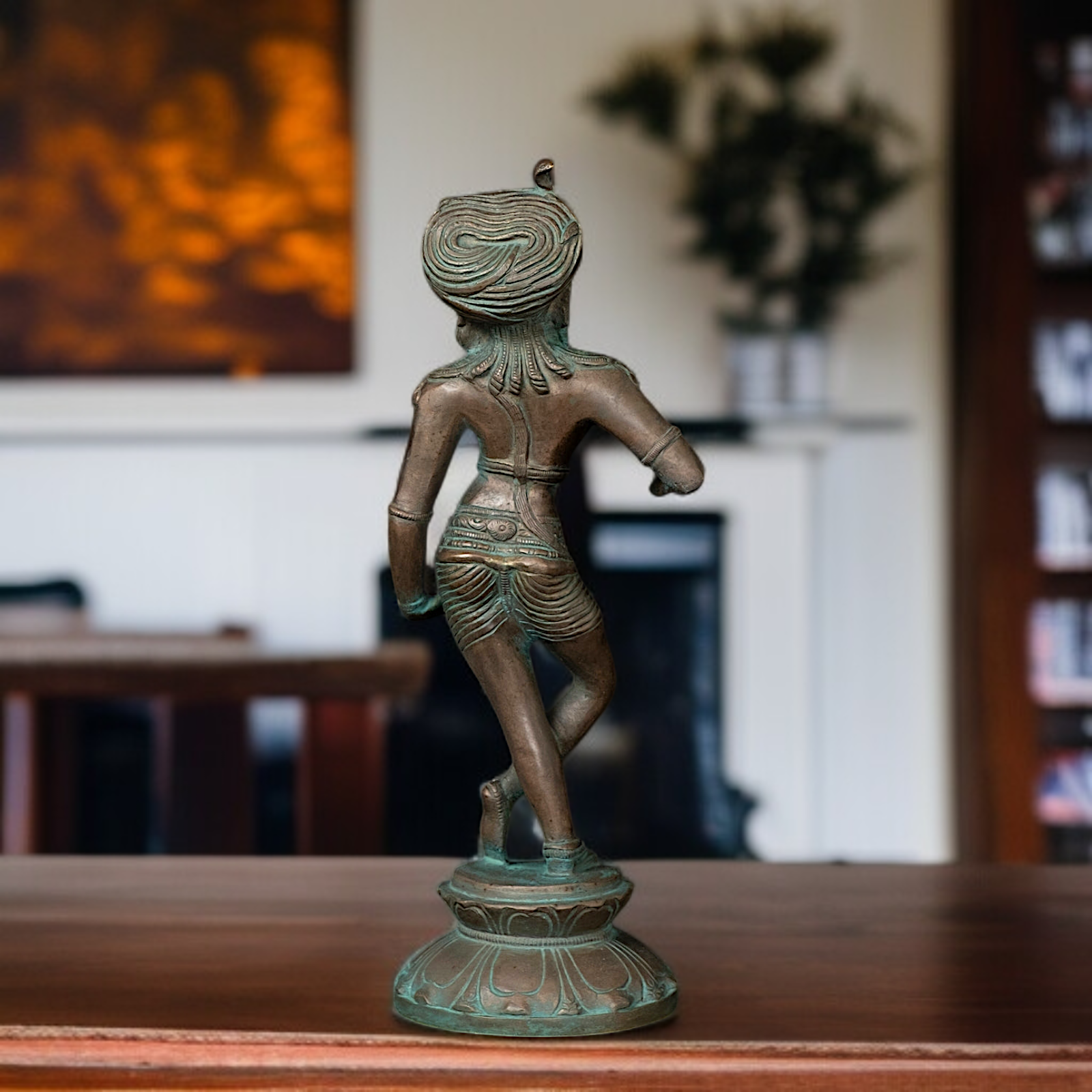 In this Chola-style brass sculpture, Shiva stands in a majestic posture, his right hand resting on the back of Nandi—his sacred bull and loyal mount, also called Nandikeshvara. Nandi, often considered a divine vehicle of Shiva, symbolizes strength, devotion, and purity. Shiva's connection with Nandi reflects the harmonious relationship between the divine and its faithful servant.
