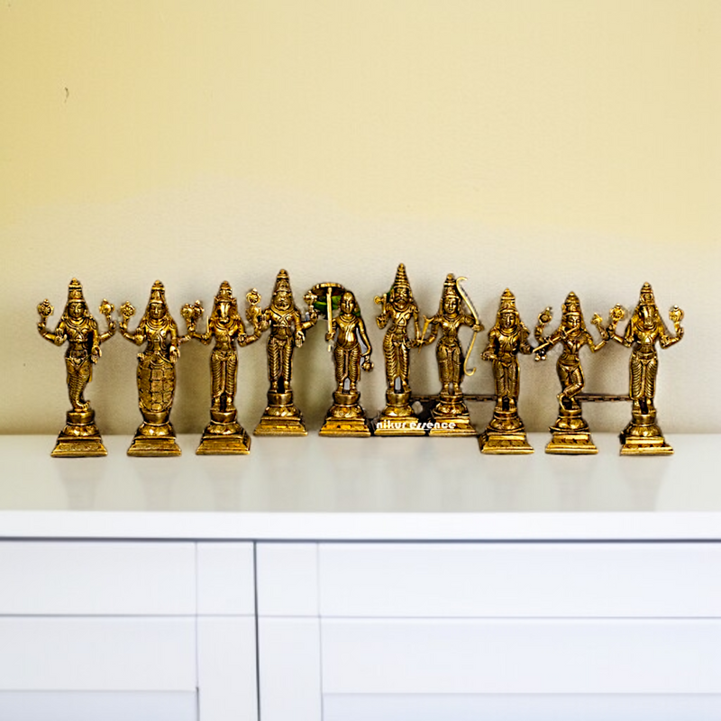 Celebrate the divine journey of cosmic preservation with this intricately crafted Lord Vishnu Brass Statue by Nikur Essence, symbolizing his ten powerful incarnations—collectively known as the Dashavatara. Revered as the Supreme Preserver in Hinduism, Lord Vishnu is believed to have descended in various forms across the four Yugas (epochs) to restore balance, protect the righteous, and uphold dharma.
