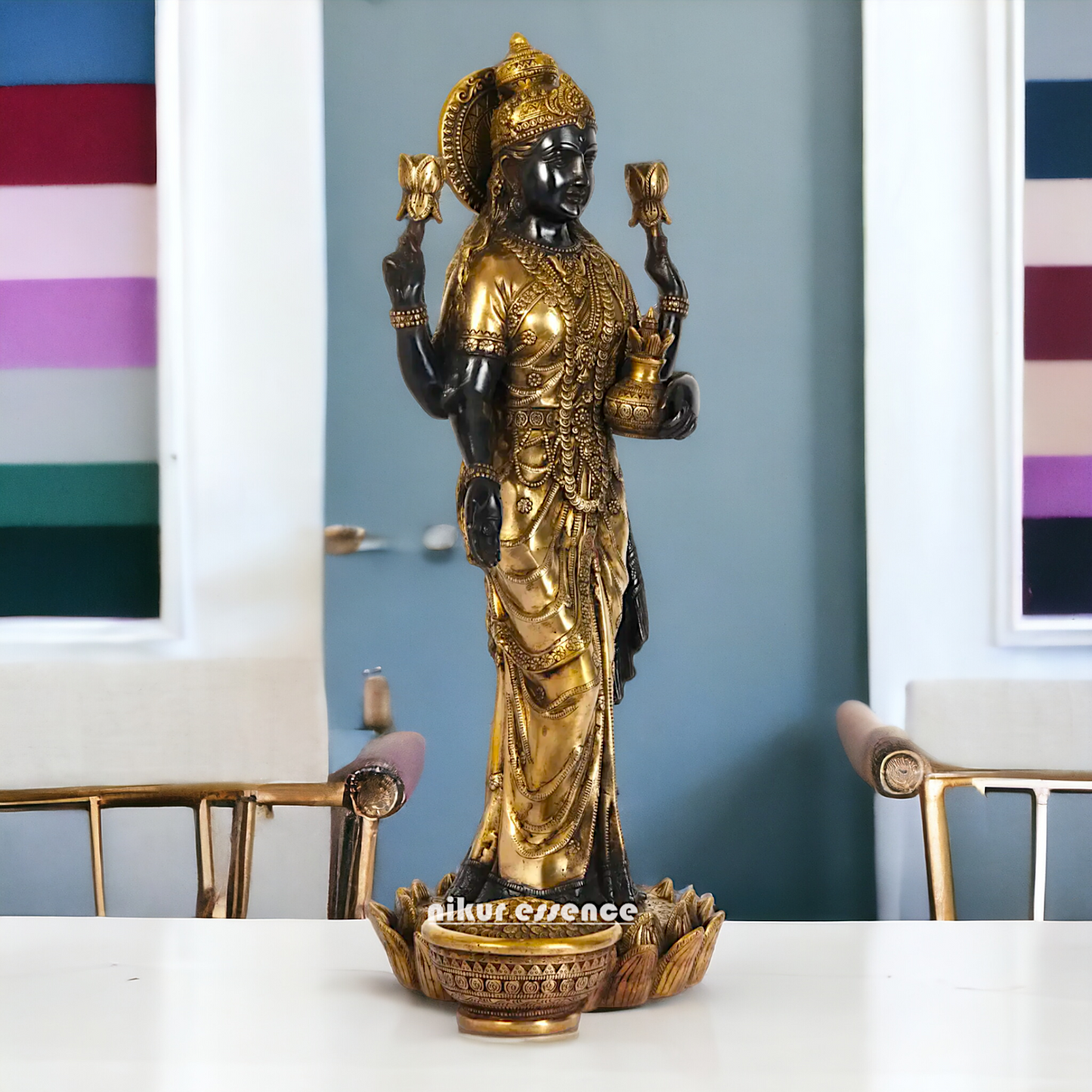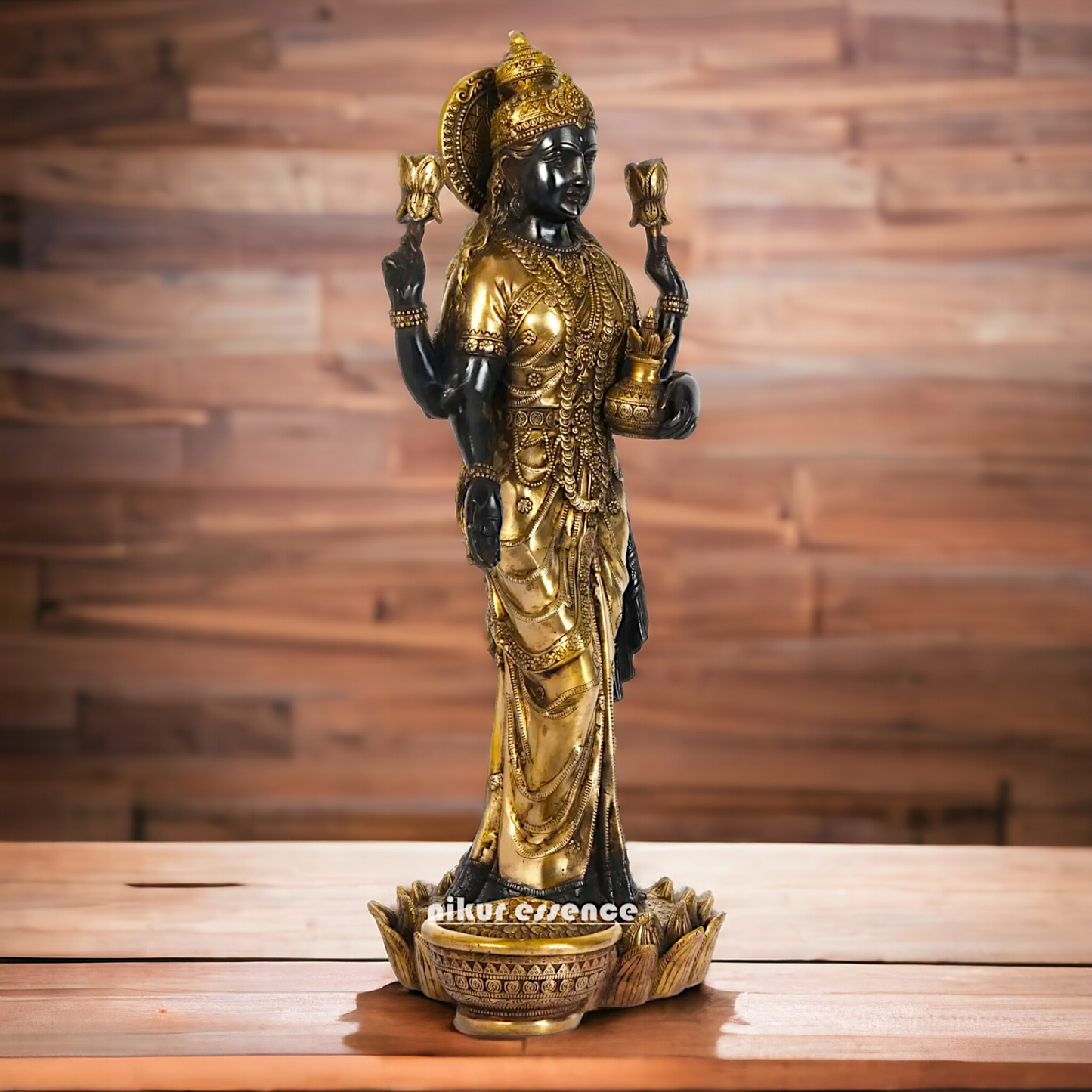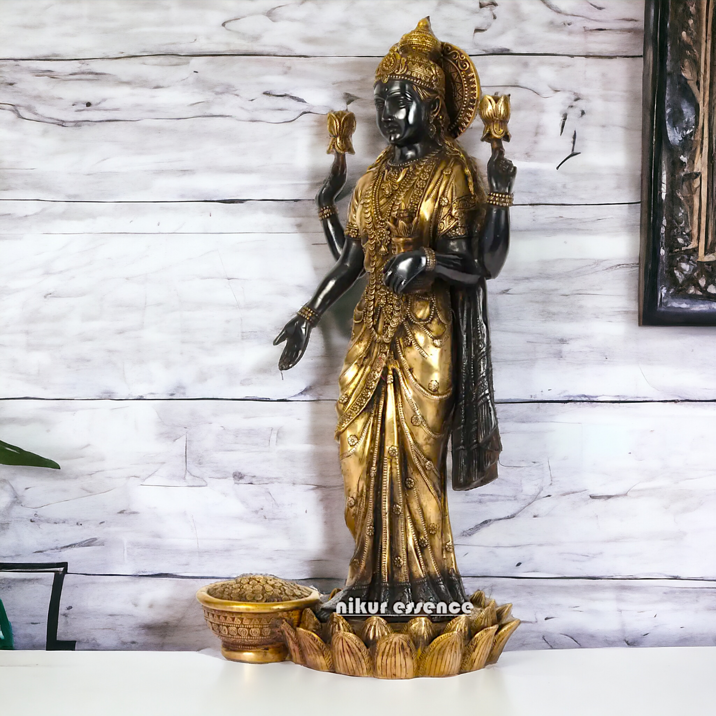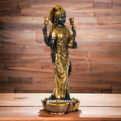 divine grace and prosperity with our Elegant Lakshmi Stand on Lotus Idol, measuring 62 cm in height. Crafted with meticulous attention to detail, this exquisite statue features Goddess Lakshmi gracefully seated on a lotus flower, symbolizing purity, beauty, and abundance. Made from premium quality resin, this idol boasts a stunning finish and intricate detailing, making it a perfect addition to your home décor, temple, or spiritual space.