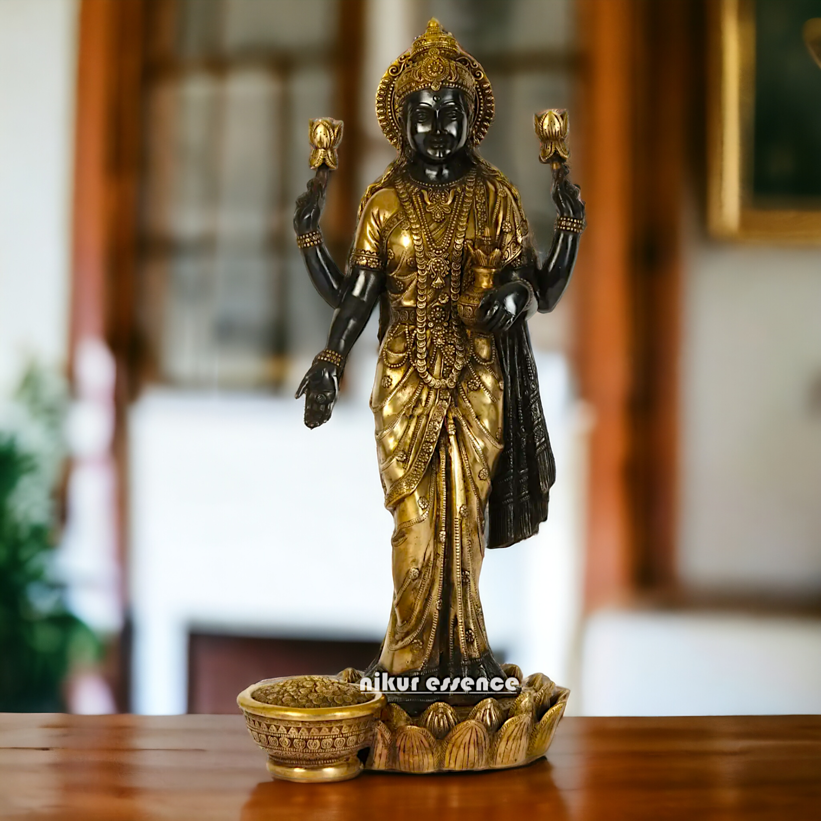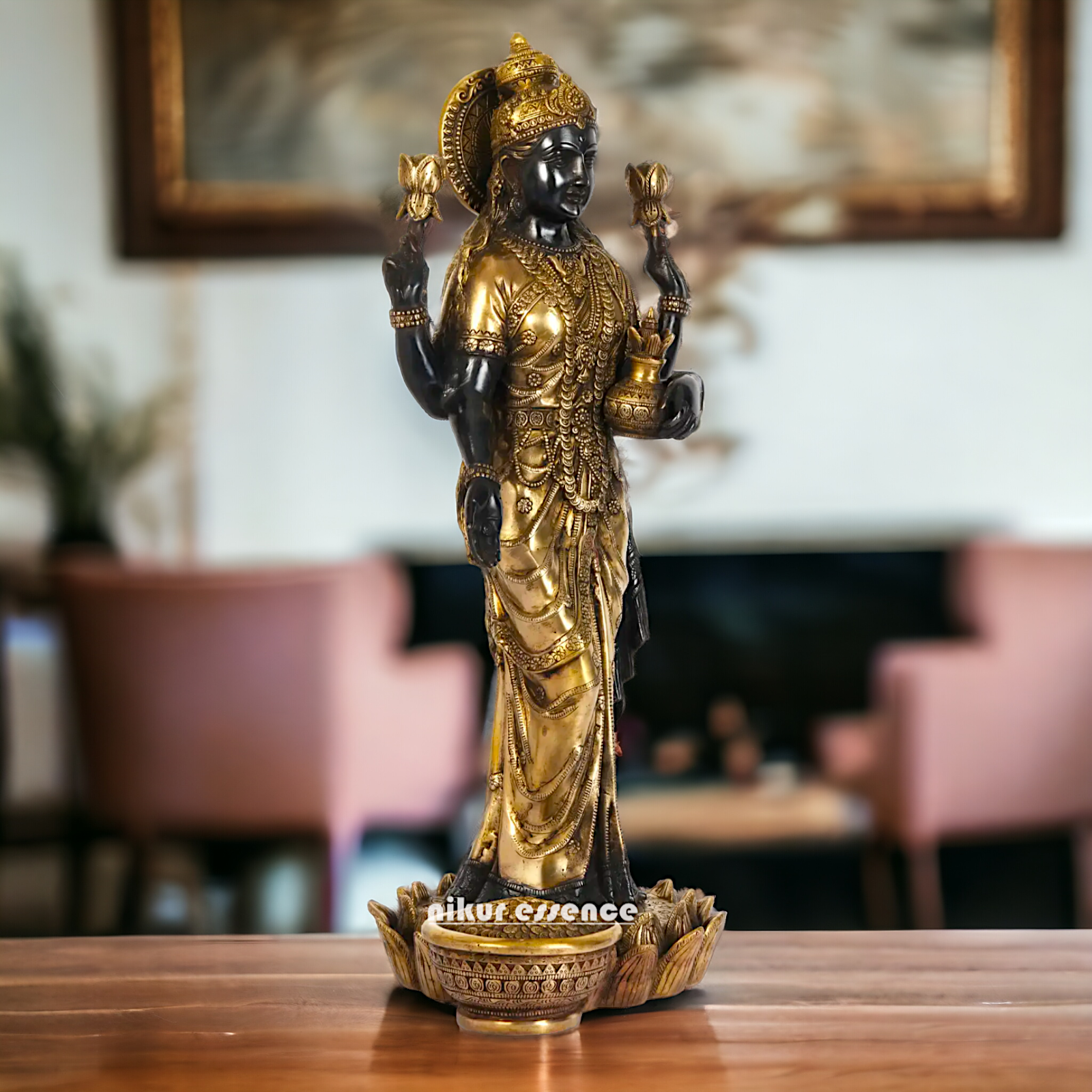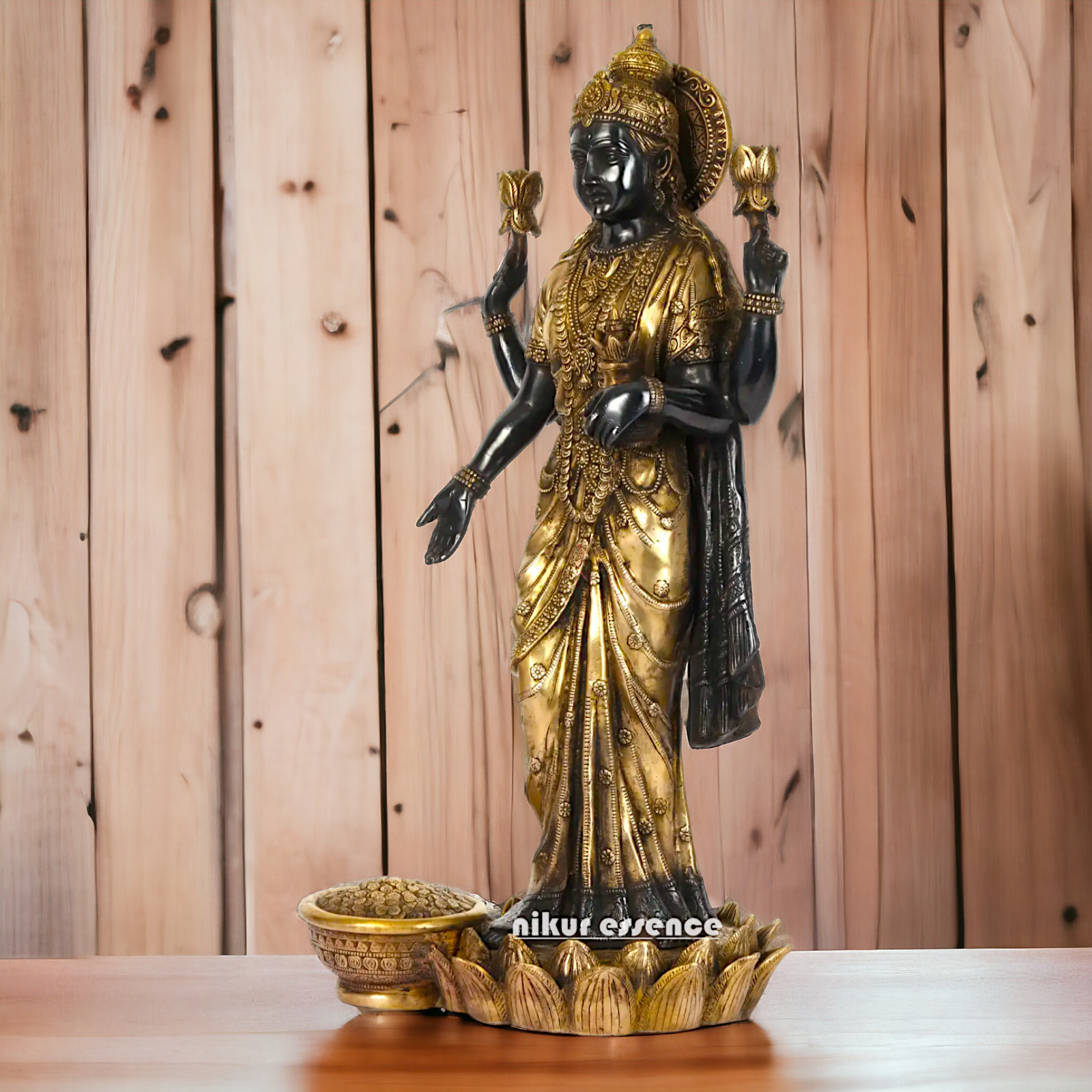 divine grace and prosperity with our Elegant Lakshmi Stand on Lotus Idol, measuring 62 cm in height. Crafted with meticulous attention to detail, this exquisite statue features Goddess Lakshmi gracefully seated on a lotus flower, symbolizing purity, beauty, and abundance. Made from premium quality resin, this idol boasts a stunning finish and intricate detailing, making it a perfect addition to your home décor, temple, or spiritual space.