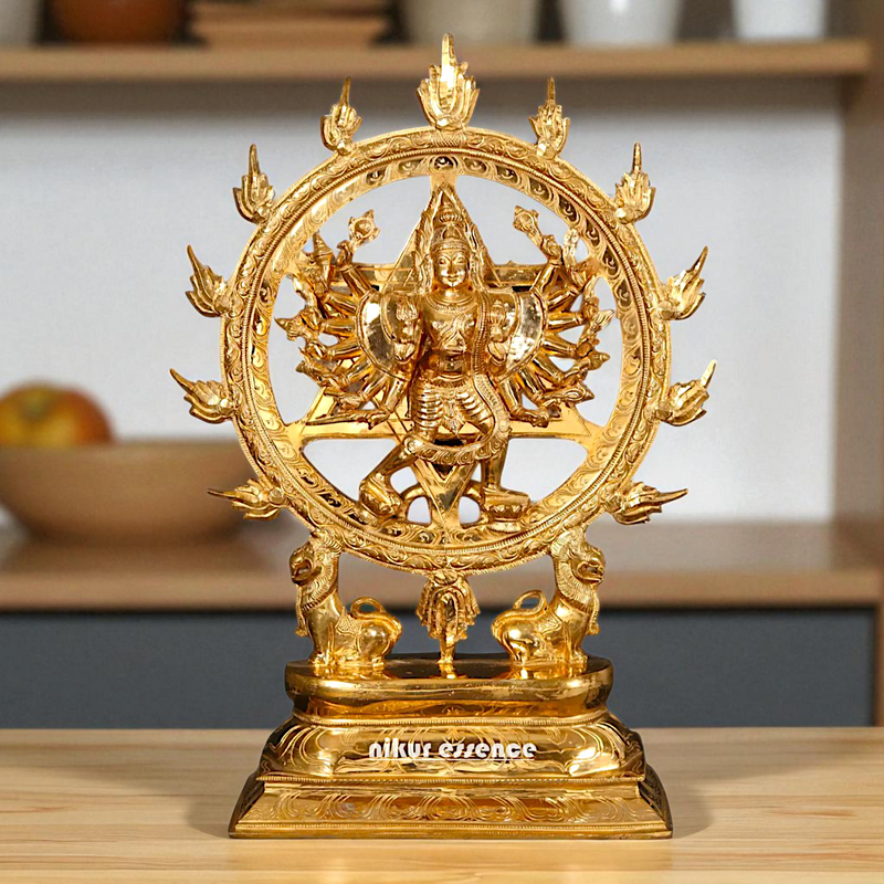 Chakrathalwar Vishnu Panchaloha Idol (21 Inches) from Nikur Essence. This powerful statue represents Lord Vishnu in his divine Chakrathalwar form, symbolizing protection, righteousness, and cosmic balance. Crafted from the sacred Panchaloha (five-metal alloy), this intricately detailed idol exudes divine energy and strength. Ideal for home altars, temples, and meditation spaces, it serves as a beacon of spiritual power, warding off negativity and inviting prosperity and peace.