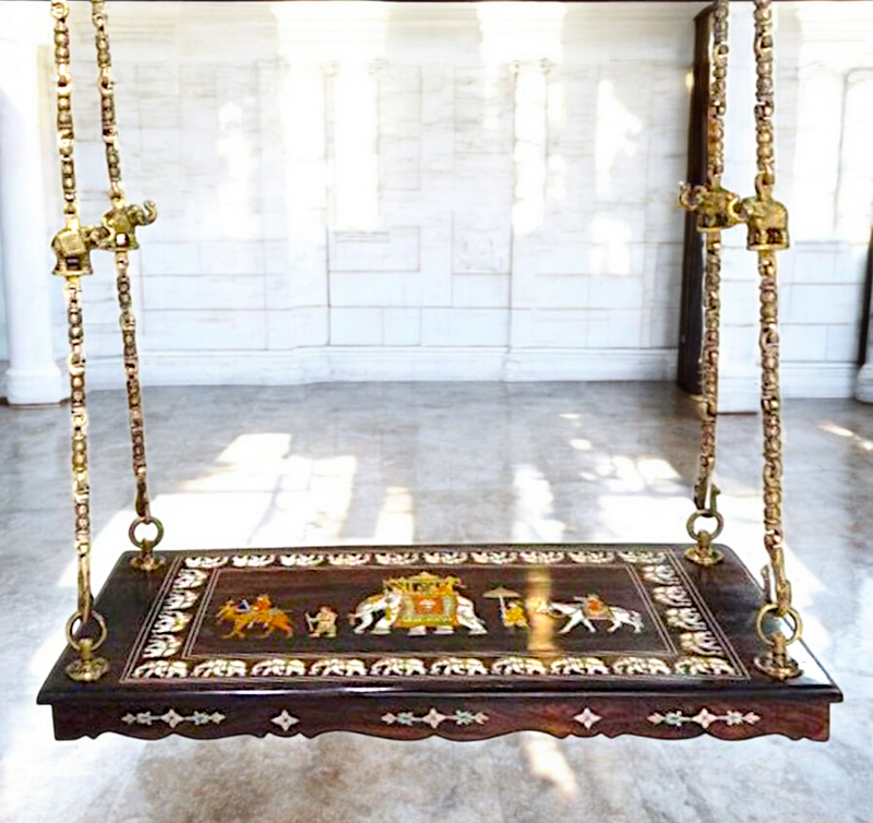 Add a touch of elegance, tradition, and craftsmanship to your home with the Nikur Essence Handcrafted Rosewood Swing Plank. Designed with delicate inlay work on premium solid rosewood, this Oonjal (Jhoola/Swing) plank blends timeless artistry with durability.