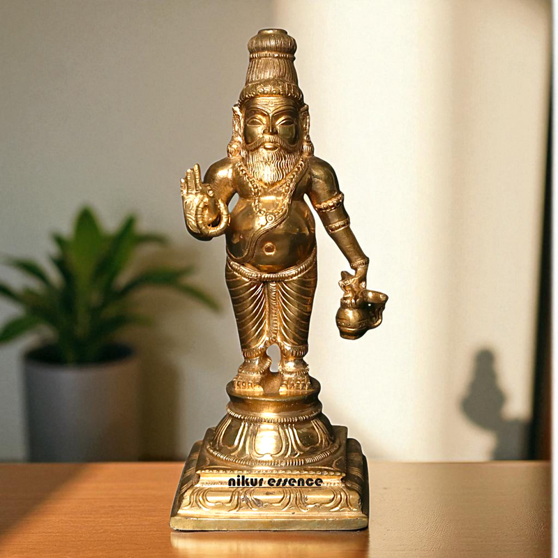 Step into the mystic past with this intricately crafted brass idol of Agastya Muni, a revered sage whose presence bridges the realms of Sanskrit and Tamil traditions. This exquisite piece from Nikur Essence pays homage to Agastya's profound influence as a Saptarishi—one of the seven divine seers mentioned in Vedic scriptures—and as a foundational figure in Tamil Siddha philosophy.