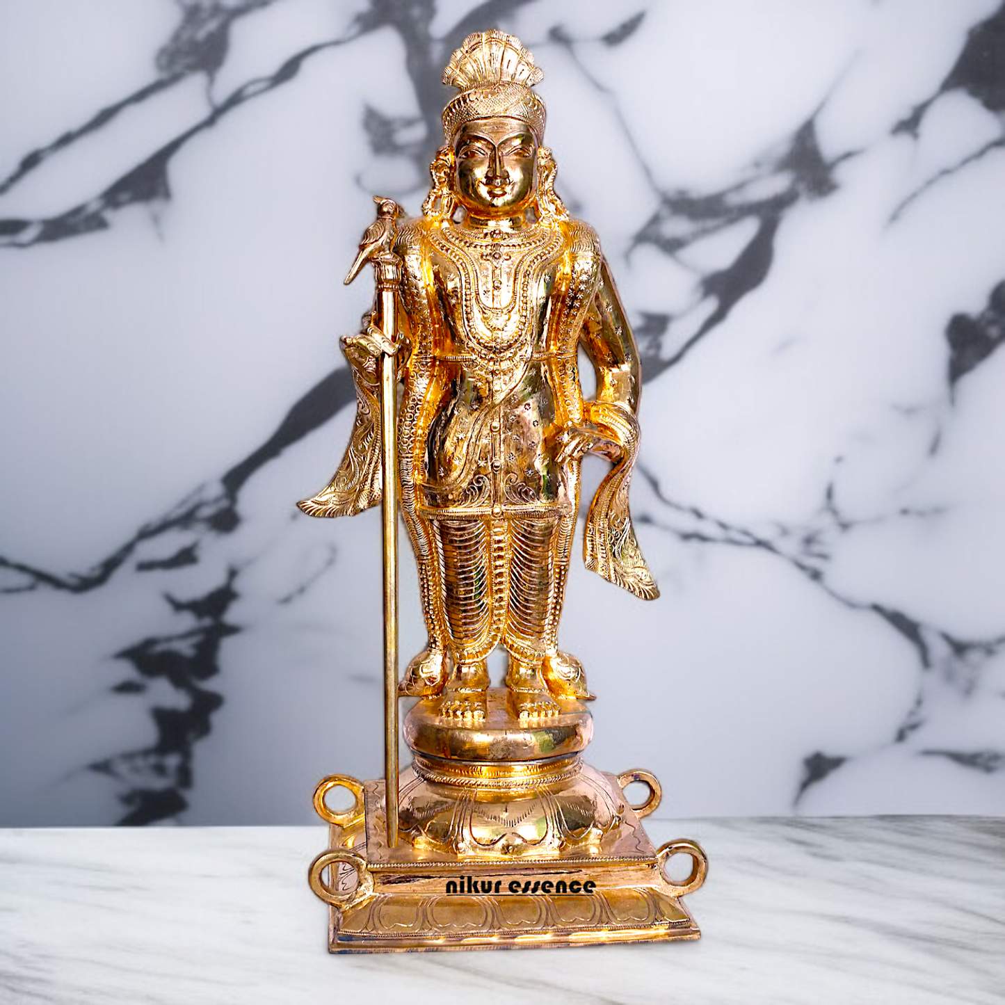 Elevate your sacred space with the Panchaloha Kartikeya Murugan Standing Idol – 24 Inches by Nikur Essence. This intricately handcrafted statue captures Lord Murugan in a majestic standing posture, symbolizing wisdom, valor, and divine protection. Holding his sacred Vel, he radiates spiritual energy and victory over obstacles. Made from a revered blend of five metals, this exquisite idol is ideal for home temples, meditation areas, or as a striking spiritual décor piece. A perfect gift for devotees, housewarming ceremonies, and religious celebrations, this Murugan statue brings blessings of courage, prosperity, and righteousness.