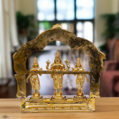 The Panchaloha Perumal with Sridevi and Bhudevi Blessing Standing Idol (13 Inches) is a sacred depiction of Lord Vishnu (Perumal) standing gracefully with Goddess Sridevi and Goddess Bhudevi, symbolizing divine prosperity, protection, and cosmic harmony. Crafted from the revered Panchaloha (five-metal alloy), this idol radiates spiritual energy, making it ideal for home altars, temples, and Vastu placements. Invite the blessings of Perumal and his consorts into your space for peace, prosperity, and divine grace.
