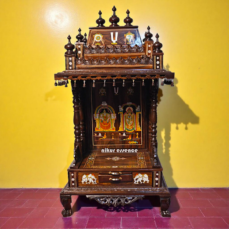 Crafted from rich, dark rosewood, known for its strength and graceful grain, this temple is more than a decorative piece—it’s a spiritual companion. At the heart of the design is a meticulously detailed carving of Lord Venkateswara, a divine symbol of protection, grace, and prosperity.