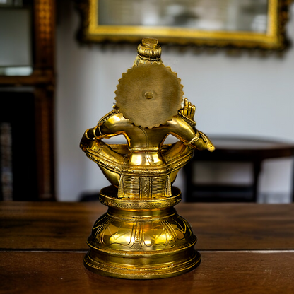 The statue is meticulously sculpted in solid brass, with smooth contours and serene expression, resonating with a quiet yet commanding spiritual presence. It captures not only the form but also the sacred essence of Ayyappan, making it ideal for devotional spaces, meditation rooms, or as a deeply symbolic spiritual gift.