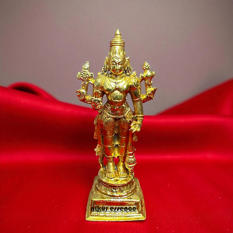 Grace your sacred space with the divine presence of Lord Vishnu, portrayed in his majestic standing posture, radiating eternal calm, strength, and divine order. This idol, part of the Nikur Essence Spiritual Heritage Series, is made using the time-honored Panchaloha alloy—a holy blend of five sacred metals: Gold, Silver, Copper, Zinc, and Iron.