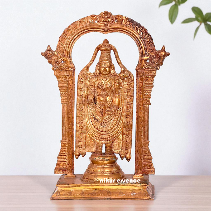 From the sacred lineage of Nikur Essence’s handcrafted bronze deities, this sculptural representation of Lord Venkateshwara (Balaji) is a manifestation of compassion, protection, and spiritual grandeur. Cast in the holy alloy Panchaloha, this idol embodies the divine energy of Lord Vishnu in his Tirupati form, venerated by millions as the savior of Kali Yuga.